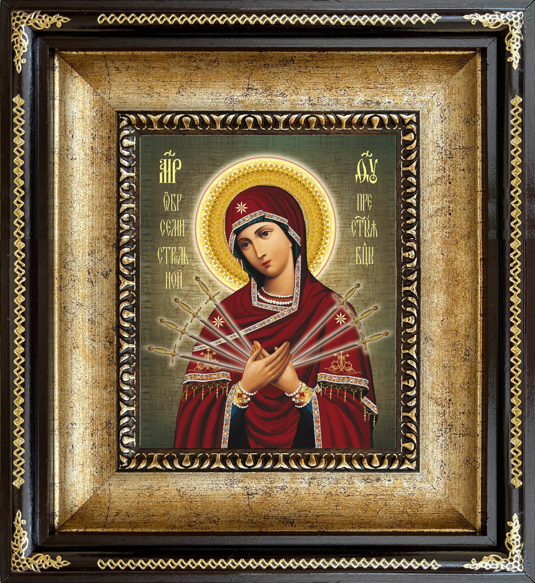 - Киот изготовлен из дерева (липа), инкрустирован стикером в цвете "золото";